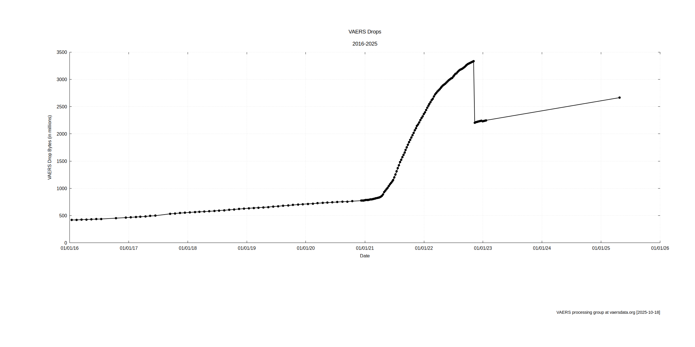 The chart titled "VAERS Drops 2016-2025" elegantly illustrates the evolution of VAERS (Vaccine Adverse Event Reporting System) data drops, measured in millions of bytes, spanning from January 2016 to January 2025. Initially, the data size remained relatively stable, oscillating between 400 and 700 million bytes from 2016 through early 2021. A marked exponential surge commenced in mid-2021, aligning with the widespread rollout of COVID-19 vaccinations, culminating in a peak exceeding 3,500 million bytes around October 2021. Subsequently, a precipitous decline occurred in November 2022, followed by a gradual stabilization at approximately 2,200 to 2,500 million bytes through early 2025 [1].